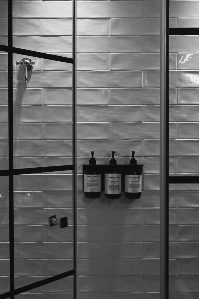 窓枠、アートフレーム、シャワールームのドア、床のタイル・・・