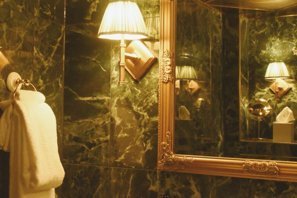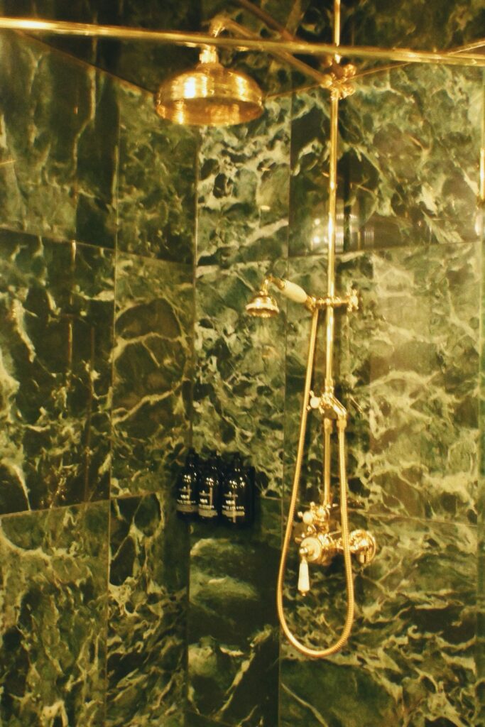 バスルームは、緑の大理石とゴールドの装飾が美しく、レインシャワーを浴びるとまるでベルゲンの静謐な雨に打たれているような気がしてくる。
