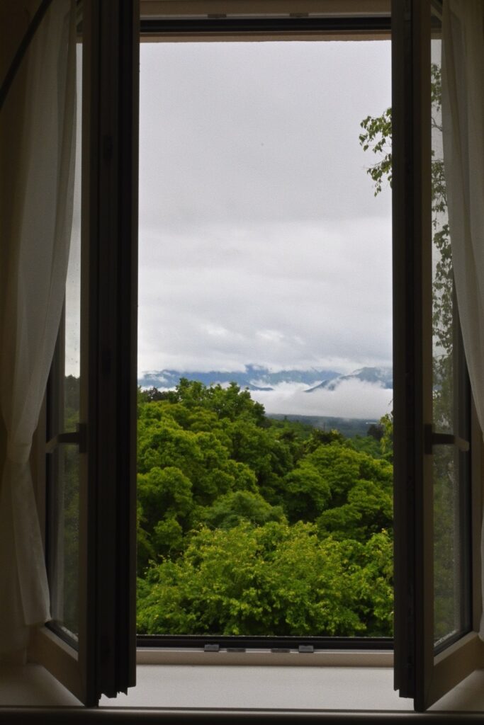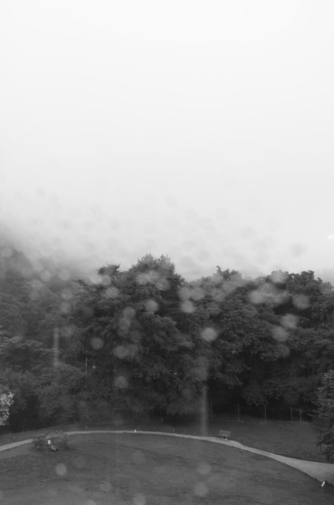 窓からは、青々とした蓼科の森。梅雨雲がどこか神秘的な雰囲気を生む。