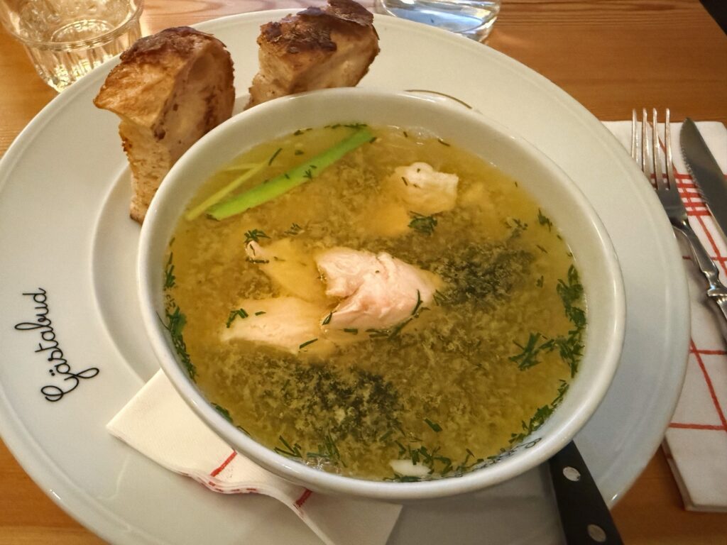 すこし甘さを感じるたっぷりのソースと甘酸っぱいベリーを合わせて食べる肉々しいミートボールはもちろん美味かったが、最初に食べたサーモンのスープがかなり美味。塩気も控えめで旨みたっぷりの優しい味わいは日本人の口にもとても合うと思う。レモングラスの酸味もクセになる。付け合わせのバゲットに塗るガーリックマヨネーズも最高で、ちょっとスープに浸せば極上のハーモニーが口いっぱいに広がる。