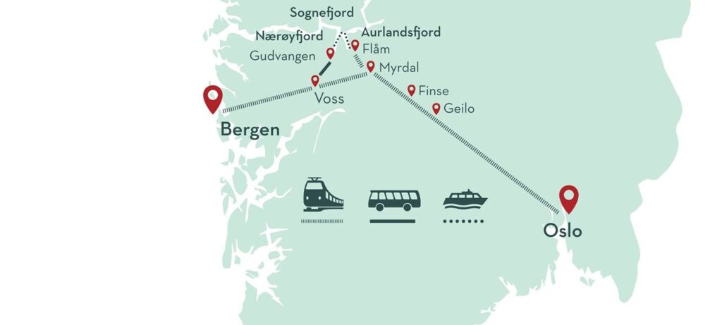 ルートは、ベルゲン発オスロ着のコースと、それと真逆のオスロ発ベルゲン着の2つがある。いずれにしてもノルウェーの東西を横断し、最大都市のオスロと第二の都市ベルゲンに立ち寄ることができる便利なコースだ。今回はベルゲン発オスロ着のコースを前提とする。