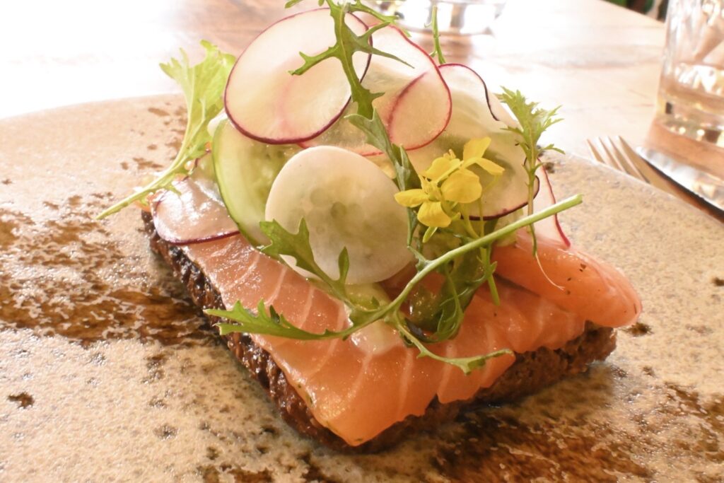 今回、ニシンとサーモンとスモーブローをいただいたが、美しい盛り付けに心躍ること間違いなしだ。味も複雑な味わいに、様々な触感が合わさって、なるほど、これはおいしい。特にニシンのほうは酢漬けされたニシンがきりっとした酸味で、気に入った。苦手でなければ、ぜひチャレンジしてみてほしい。なお、スモーブローは手で食べるのではなく、ナイフフォークで食べるのがマナーだが、私のナイフフォークの使い方が悪かったのかもしれないが、下の黒パンが全然切れなくて、最終的には手で掴んだ(笑)