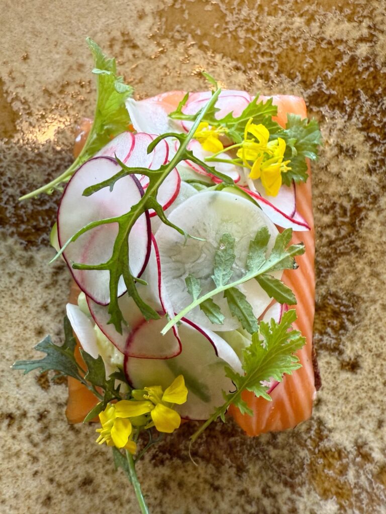 黒パンの上に広がるのは、北欧の大地と海の恵みを描いた小さなキャンバス。
